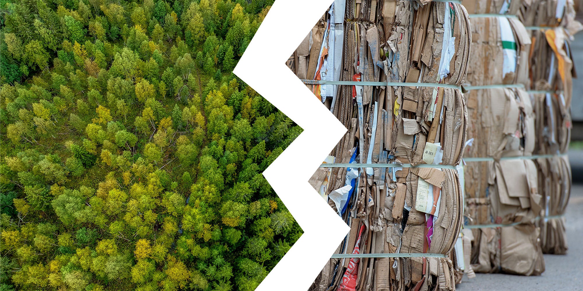 Nyfiber: färskt, starkt och svenskt. Tillverkat av FSC- och PEFC-certifierad skog som växer snabbare än den avverkas – korta transporter och lägre utsläpp. Returpapper: gjort av återvunnet material – bra för träden, men kräver energi och kemikalier för att rengöras. Fibrerna blir också svagare för varje återvinning.