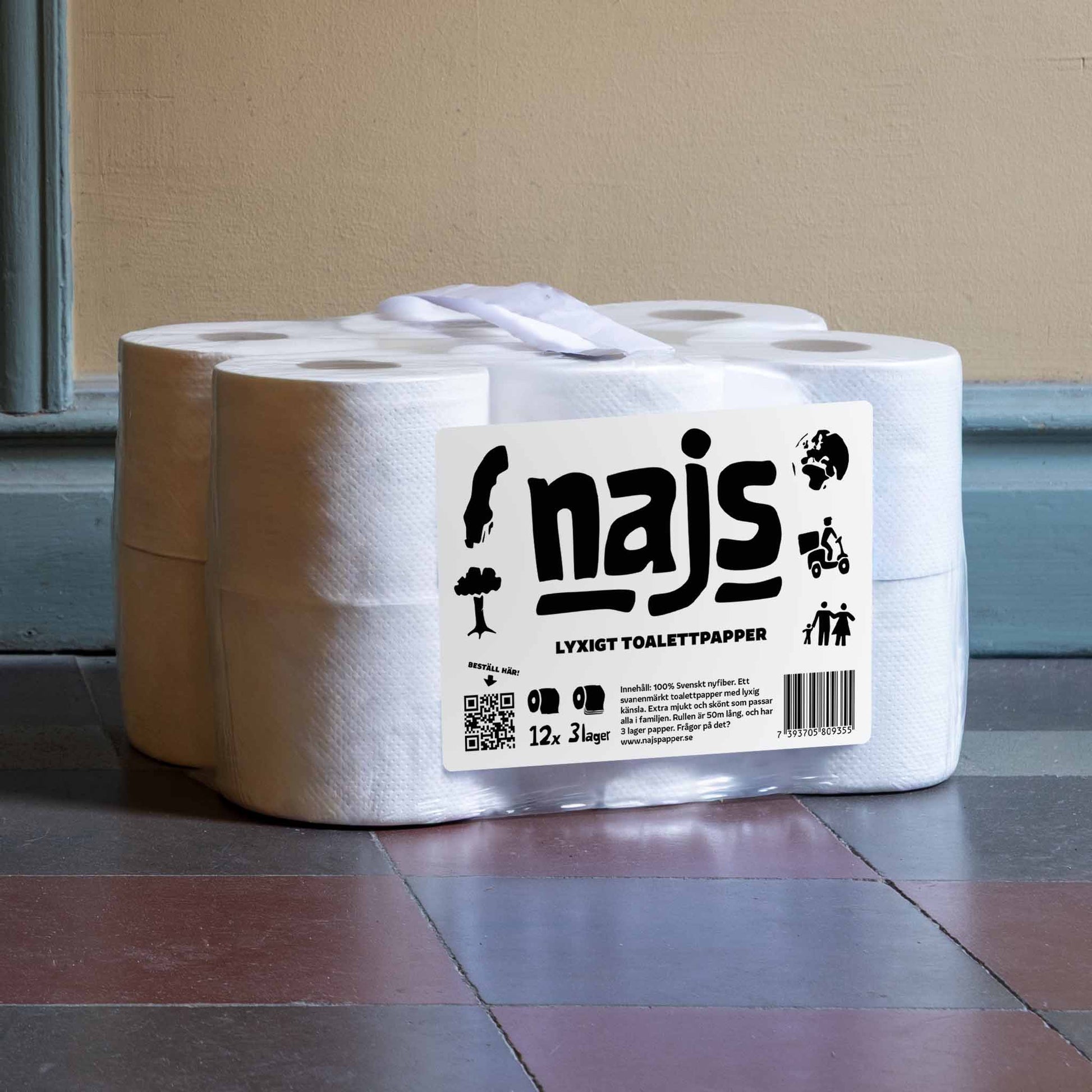Najs Papper toalettpapper. Tjockt trelagerspapper. Svanenmärkt, mjukt och hållbart. Rullen är på 50 meter som motsvarar 3 vanlig rullar. 12 rullar i en bal. Perfekt för familjen som vill ha komfort och lyx. Leverans till dörren ingår i priset. Ett nice papper helt enkelt.