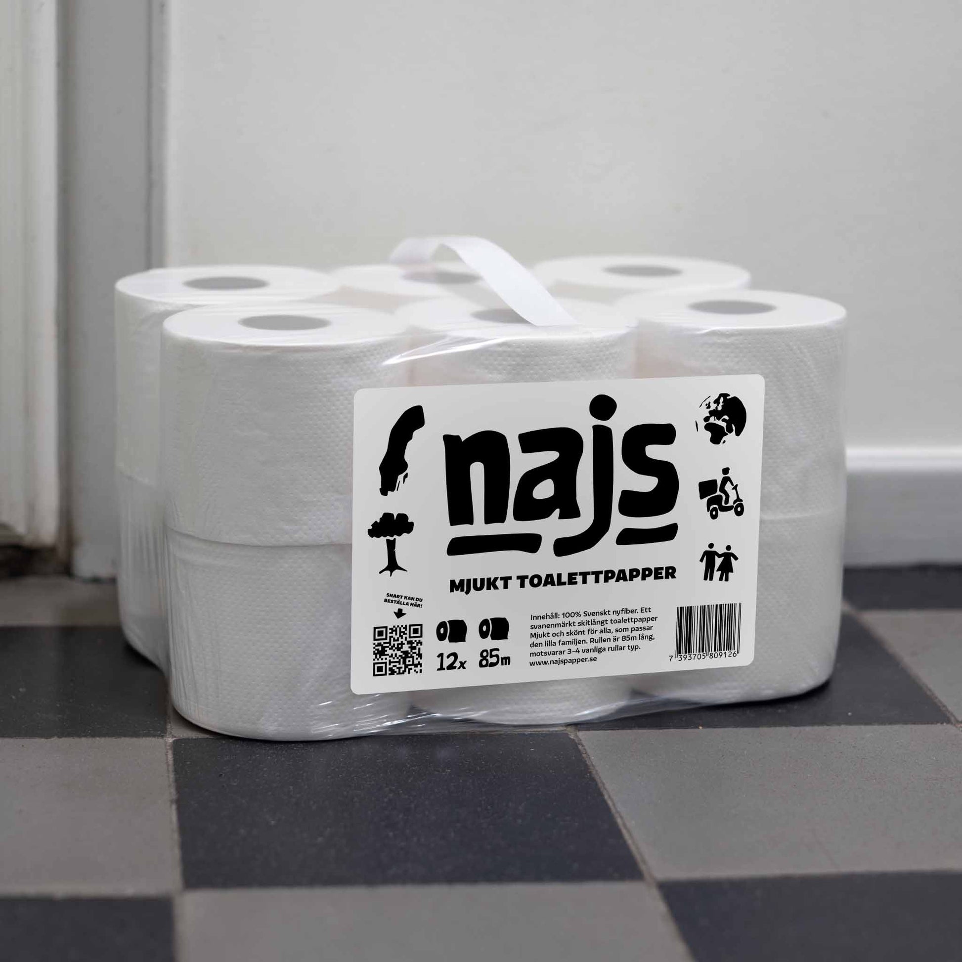 Najs Papper toalettpapper. Långt tvålagers– Svanenmärkt, mjukt och hållbart. En rulle på 85 meter som motsvarar 3–4 vanliga rullar. 12 rullar i en bal. Perfekt för den lilla familjen! Leverans fram till dörren ingår i priset.