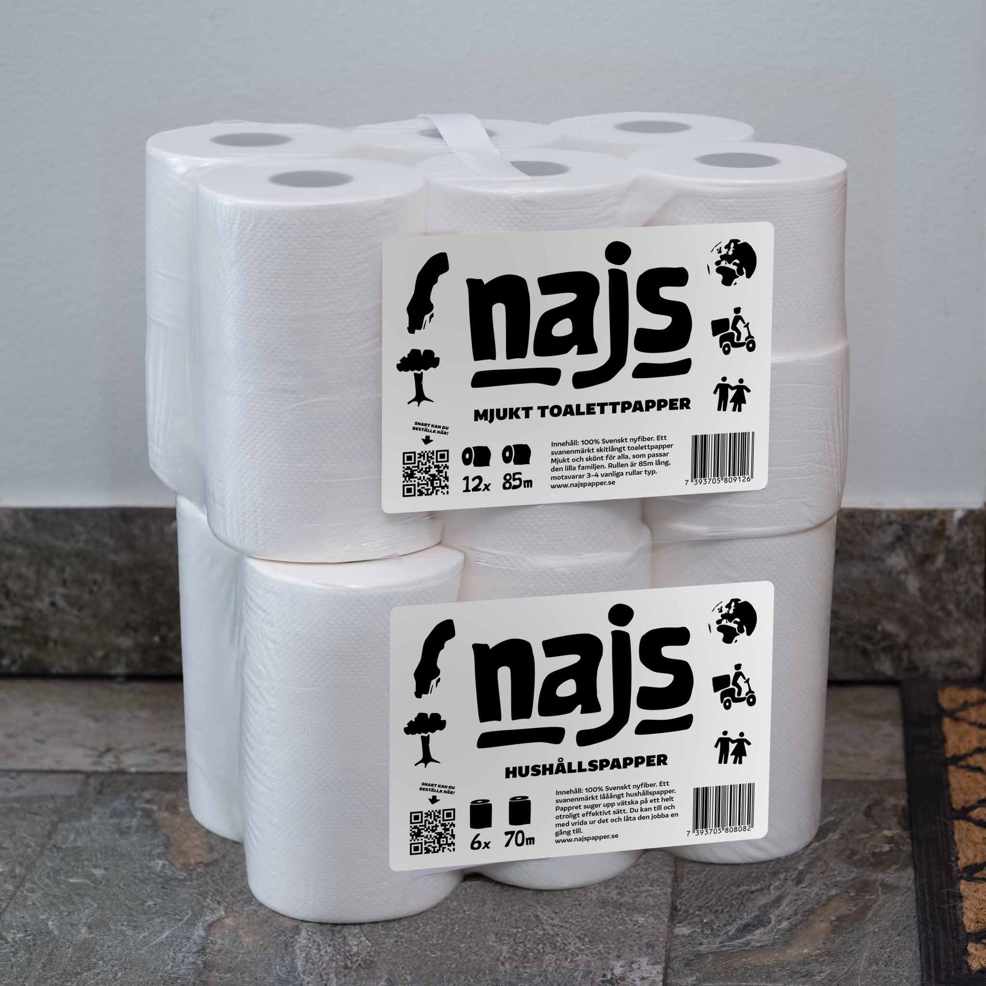 Tvålagers toalettpapper 85 meter, 12 rullar + Hushållspapper 70 meter, 6 rullar. Perfekt för den lilla familjen! Leverans fram till dörren ingår i priset.